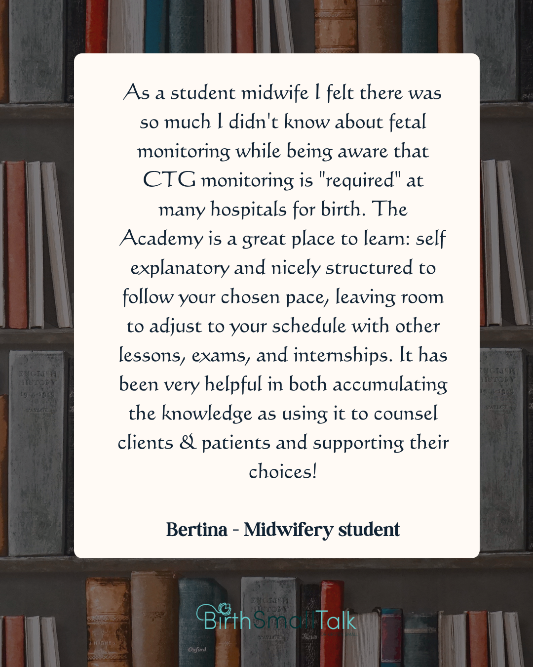 As a student midwife I felt there was so much I didn't know about fetal monitoring while being aware that CTG monitoring is "required" at many if not all hospitals for birth whilst little evidence is known. The Academy is a great place to learn: self explanatory and nicely structured to follow on your chosen pace, leaving room to adjust to you schedule with other lessons, exams and internships. It has been very helpful in accumulating knowledge and using it to counsel clients & patients and supporting their choices!