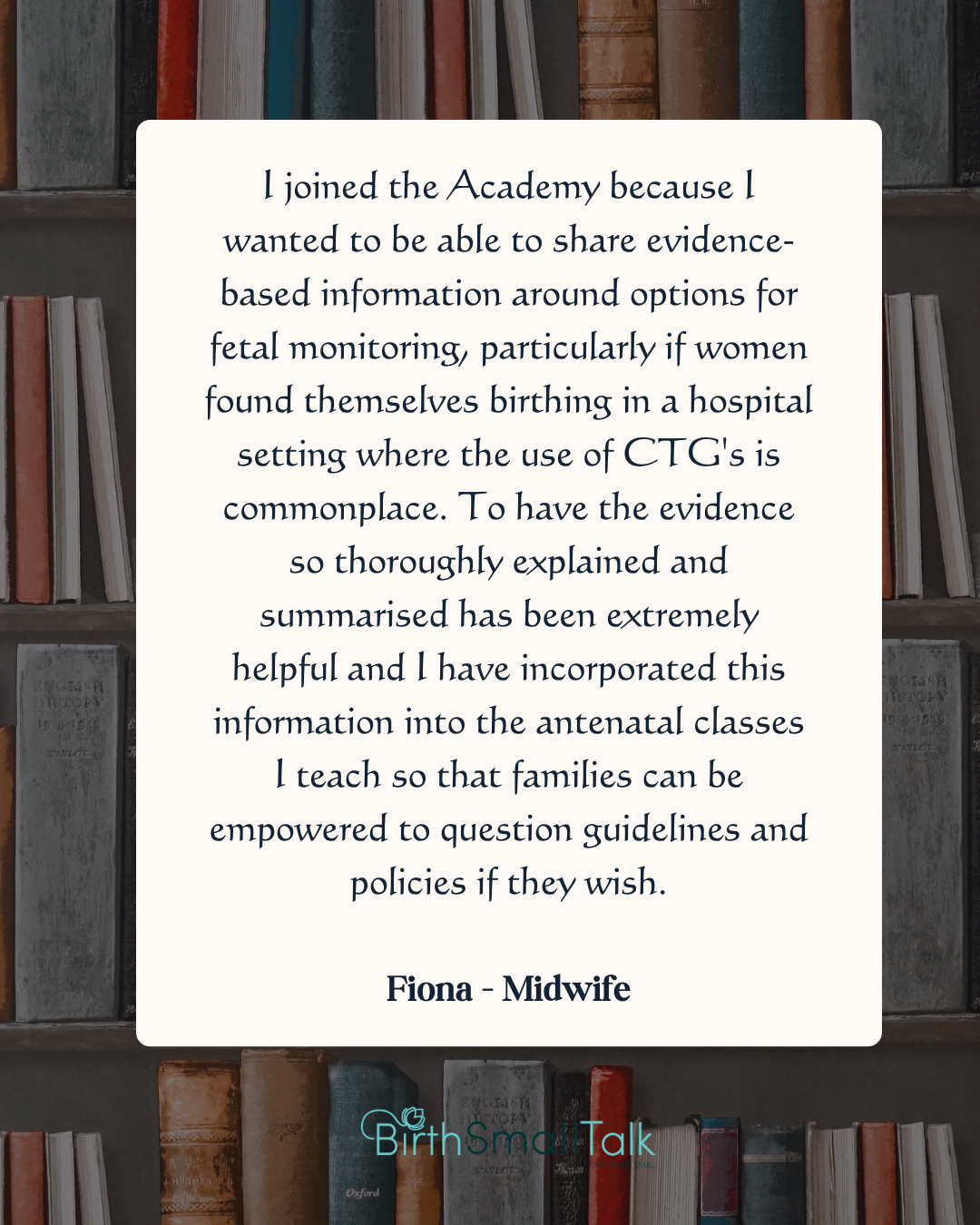 I joined the Academy because I wanted to be able to share evidence-based information around options for fetal monitoring, particularly if they found themselves birthing in a hospital setting where the use of CTG's is commonplace. To have the evidence so thoroughly explained and summarised has been extremely helpful and I have incorporated this information into the antenatal classes I teach so that families can be empowered to question guidelines and policies if they wish.